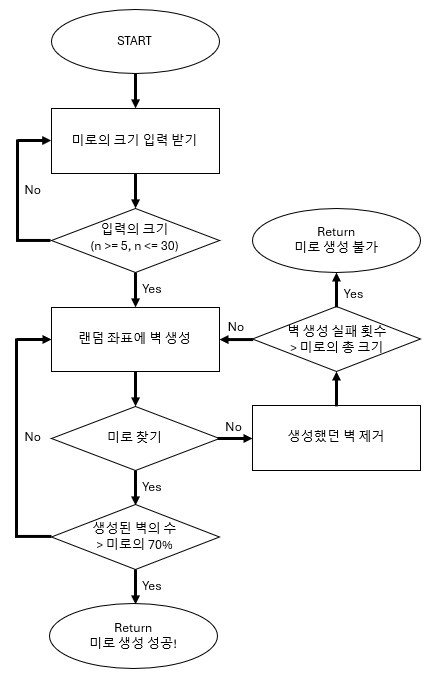 - (n * n)의 미로의 70% 이상이 벽이 될 때까지 위 과정 반복.