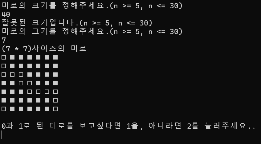 printf("미로의 크기를 정해주세요.(n >= 5, n <= 30)\n");