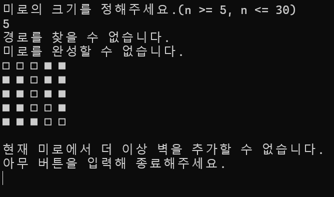 printf("현재 미로에서 더 이상 벽을 추가할 수 없습니다.\n");
