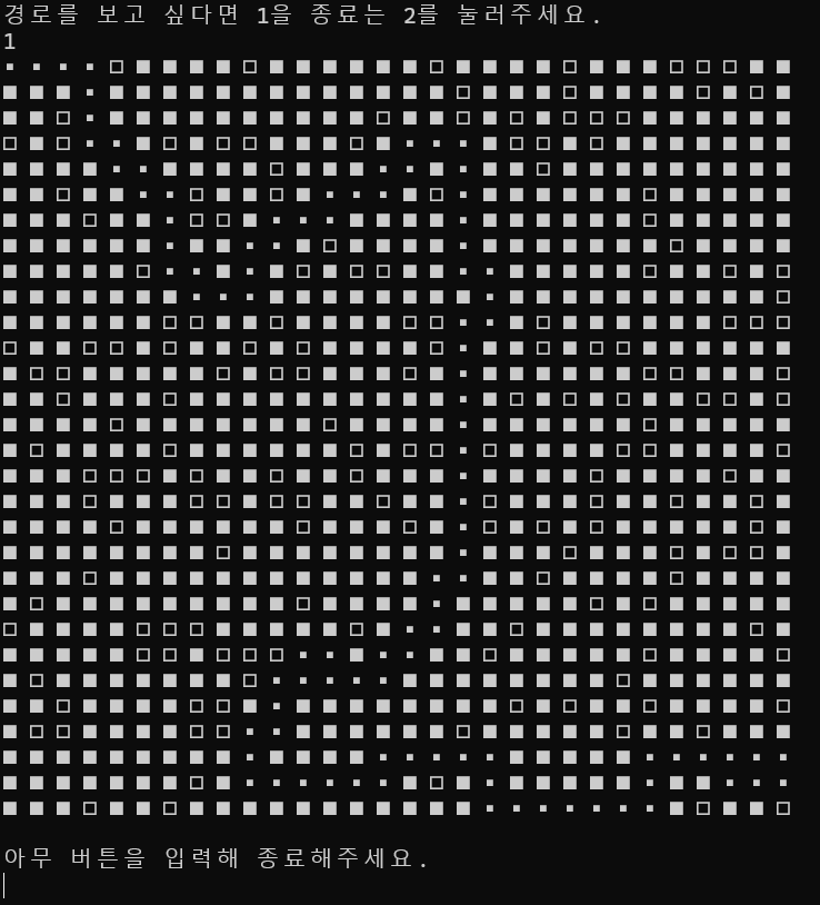 이후 0과 1로 된 맵을 보고싶으면 1을, 경로를 보고싶으면 다시 1을 누르면 된다.